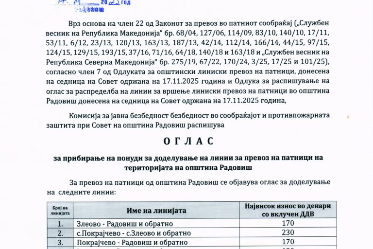 Соопштение – Повик за работно ангажирање на невработени лица за потребите на општина Радовиш