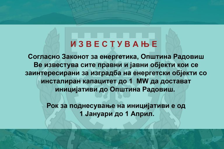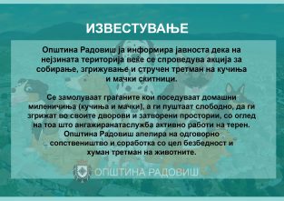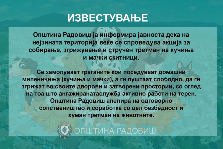 ИЗВЕСТУВАЊЕ На територијата на Општина Радовиш веќе се спроведува акцијата за собирање, згрижување и стручен…