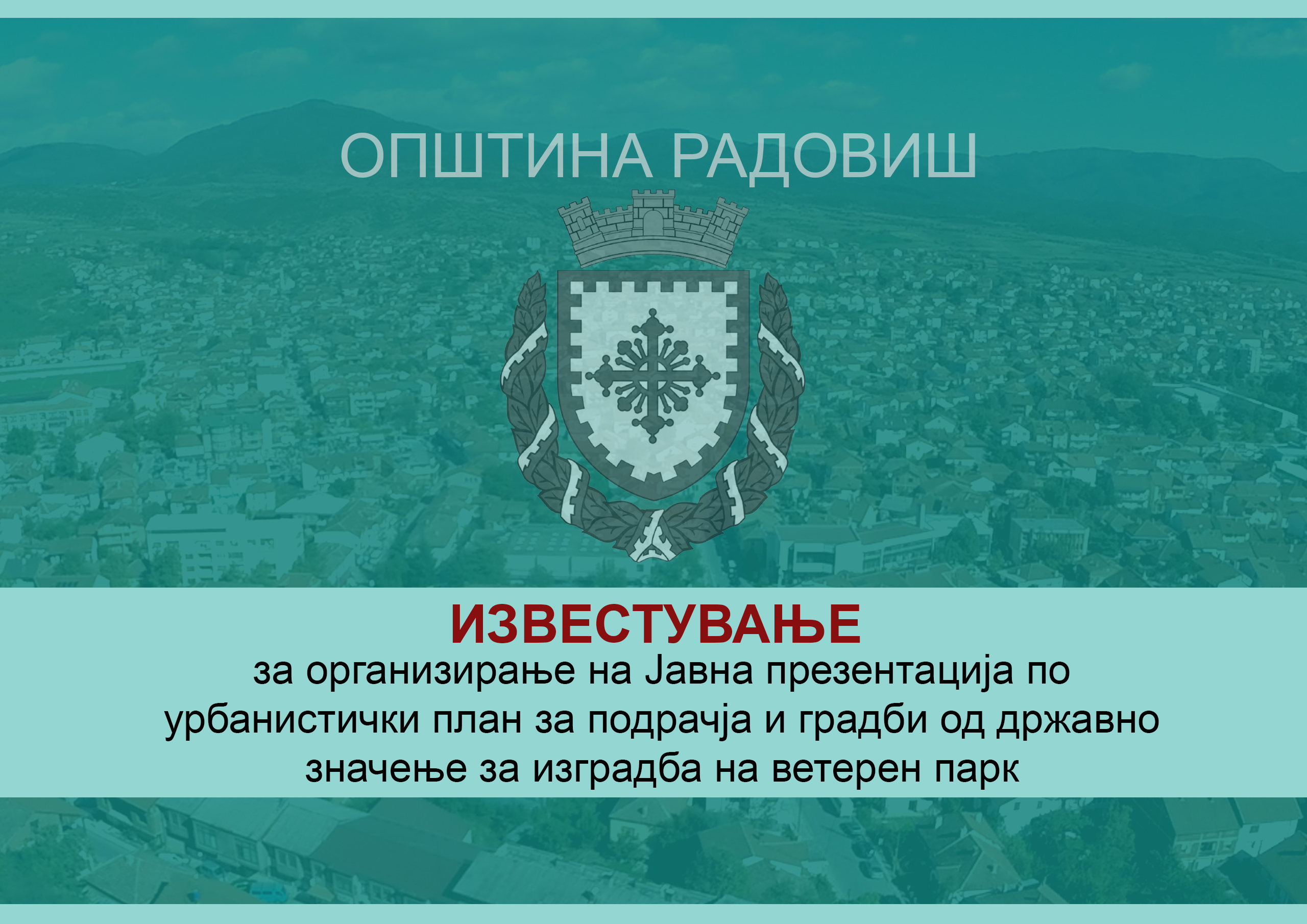 Известување за организирање на Јавна презентација по урбанистички план за подрачја и градби од државно значење за изградба на ветерен парк (за производство на електричка енергија од обновливи извори со капацитет над 10mw) во општина Штип, општина Радовиш и општина Карбинци.