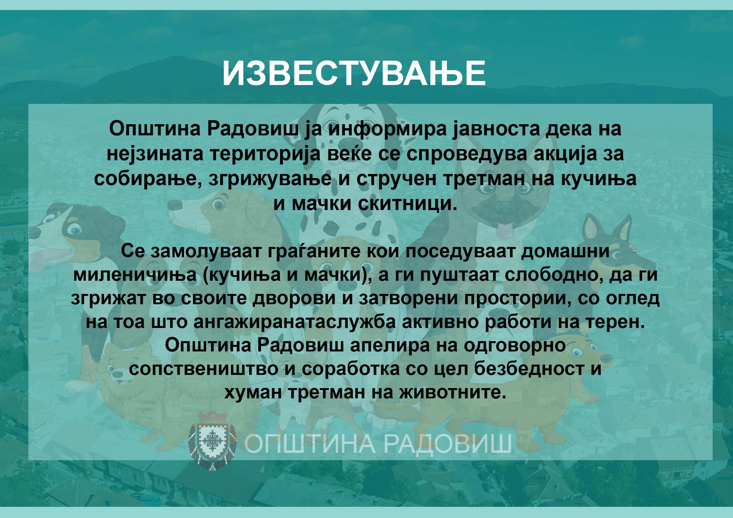 Известување за собирање, згрижување и стручен третман на кучиња и мачки скитници