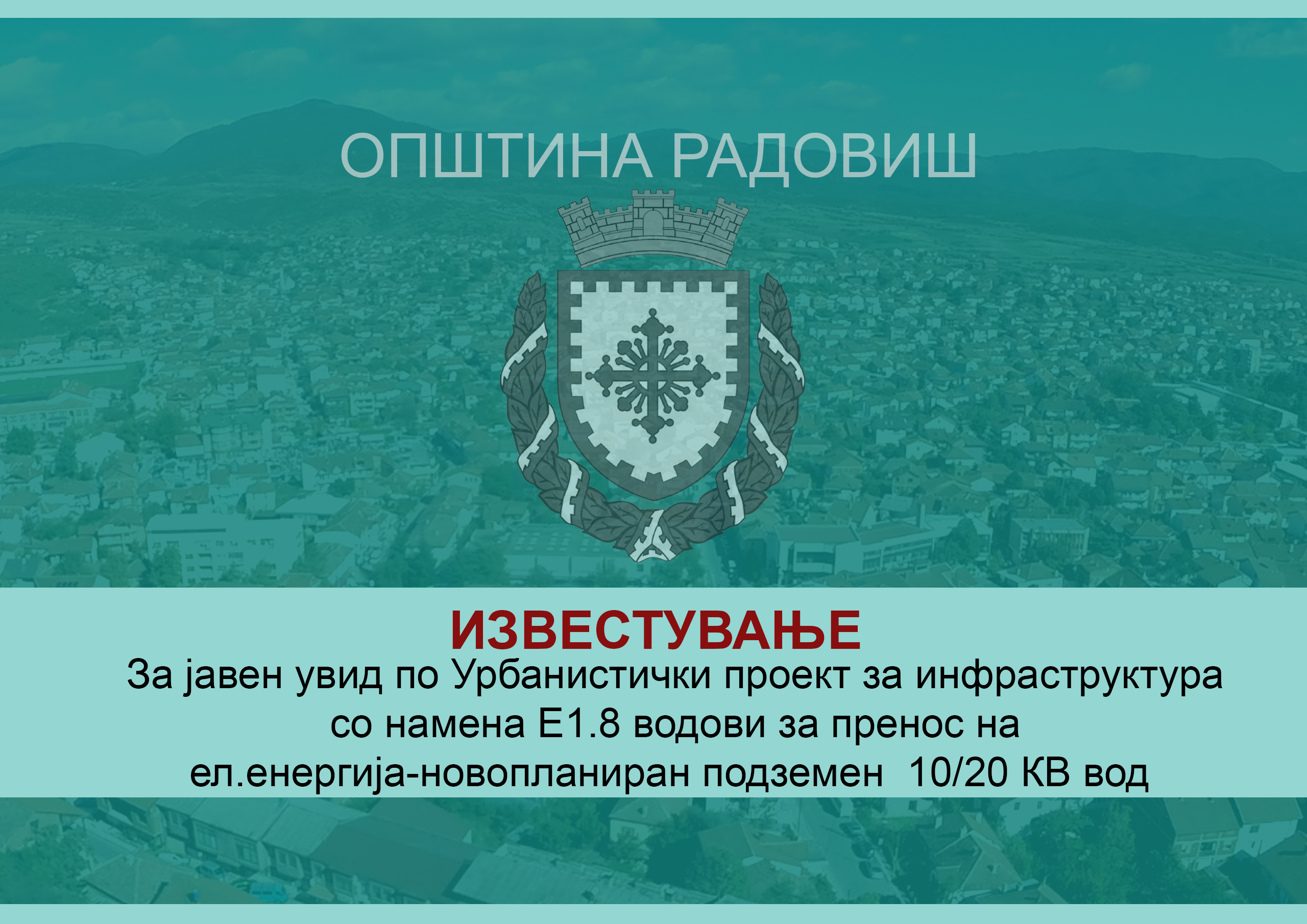 Врз основа на член 62 став(10) Законот за урбанистичко планирање („Сл. в. на РСМ“ бр.32/20), Општина Радовиш го става на јавен увид Урбанистички проект за инфраструктура со намена Е1.8 водови за пренос на ел.енергија- новопланиран подземен 10/20 КВ вод од постојна ТС на КП 4138 до столб на КП 4135/1, за дел од КП 4138, КП 5131, дел од КП 4120/1 и дел од КП 4135/1, КО Радовиш вон град, општина Радовиш.