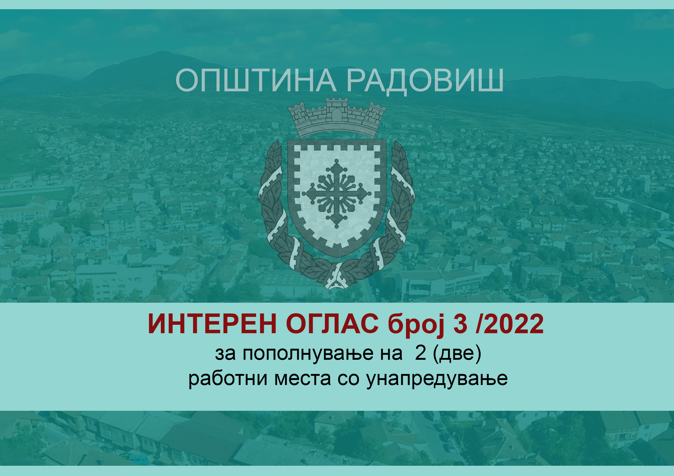 Врз основа на член 48 од Законот за административните службеници (,,Сл.весник на РМ бр. 27/14,199/14,48/15,154/15,5/16,142/16 , 11/18 и Сл.весник на РСМ бр.275/19,14/20 и 215/21) и член 2 од Правникот за формата и содржината на интерниот оглас,начинот на поднесување на пријавата за унапредување,начинот на спроведување на административната селекција и интервјуто,како и начинот на нивно бодирање и максималниот број на бодови од постапката на селекција,во зависност од категоријата на работно место за кое е објавен интерниот оглас (Сл. Весник на РМ бр.11/15 и 35/18),Општина Радовиш, објавува: