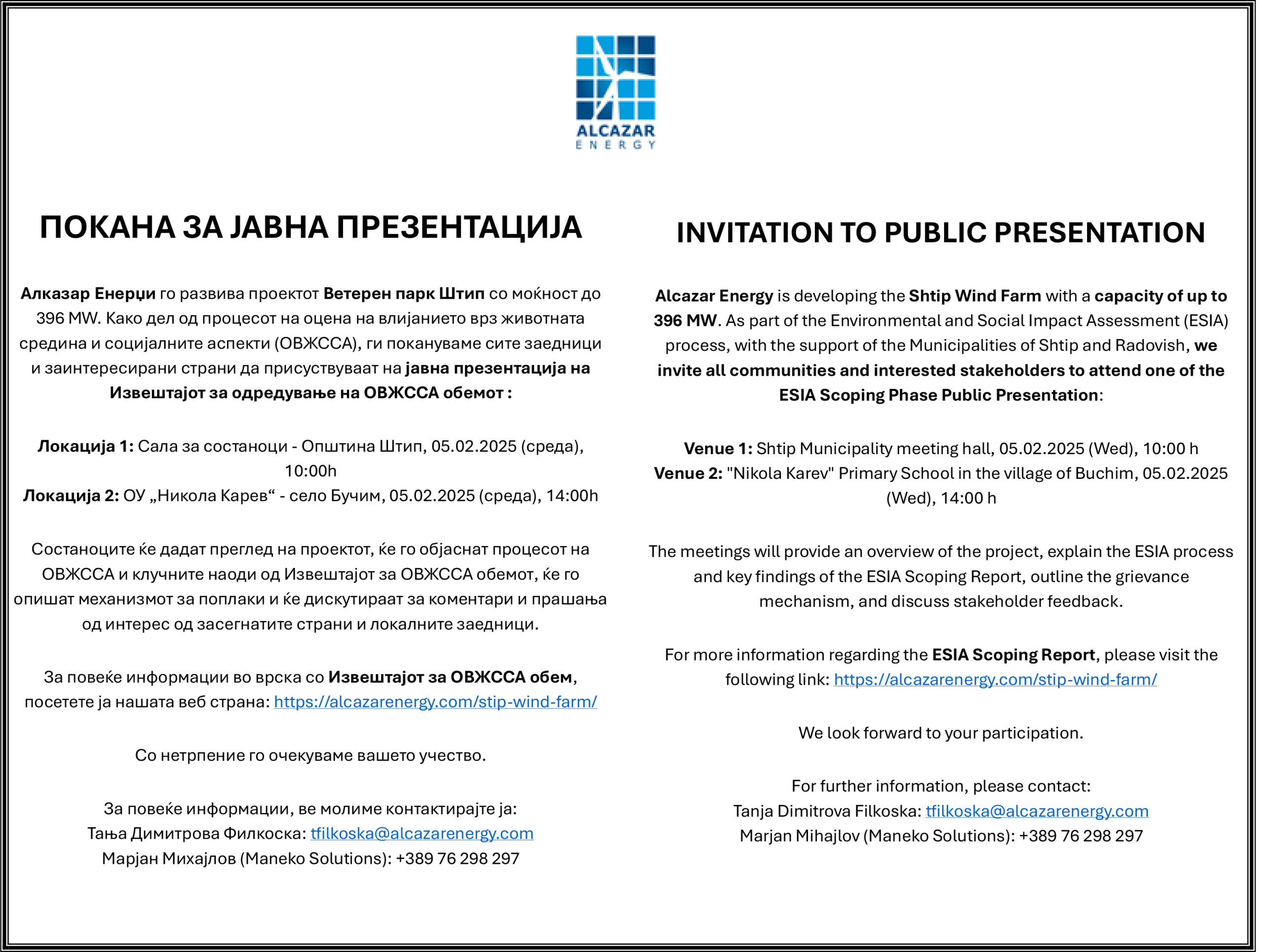 Јавните презентации на проектот Ветерен парк Штип ќе се организираат на две локации: