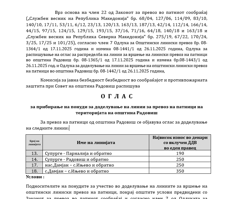 Врз основа на член 22 од Законот за превоз во патниот сообраќај („Службен весник на Република Македонија“ бр. 68/04, 127/06, 114/09, 83/10, 140/10, 17/11, 53/11, 6/12, 23/13, 120/13, 163/13, 187/13, 42/14, 112/14, 166/14, 44/15, 97/15, 124/15, 129/15, 193/15, 37/16, 71/16, 64/18, 140/18 и 163/18 и „Службен весник на Република Северна Македонија“ бр. 275/19, 67/22, 170/24, 3/25, 17/25 и 101/25), согласно член 7 Одлука за Општински линиски превоз бр. 08-1364/1 од 17.11.2025 година и измена 08-1441/1 од 26.11.2025 година, Одлука за распишување на оглас за распределба на линии за вршење на линиски превоз на патници во општина Радовиш бр. 08-1365/1 од 17.11.2025 година и измена бр.08-1443/1 од 26.11.2025 год. и Одлука за доделување на линии за вршење на општински линиски превоз на патници во општина Радовиш бр. 08-1442/1 од 26.11.2025 година,