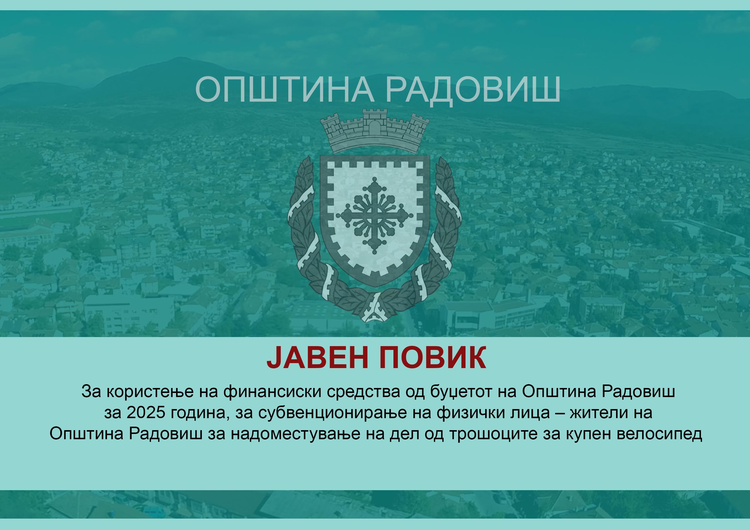Врз основа на член 20, 21 и 22 од Законот за локална самоуправа (Сл.весник на Р.М. бр.05/02), член 14, 15 и 43 од Статутот на Општина Радовиш („Службен гласник на Општина Радовиш „ бр. 07-765/1, 15.10.2002), Правиликот бр.09-696/1 од 27.05.2024 година донесен од страна Советот на Општина Радовиш, Програмата за Локален економски развој за 2025 година бр.08-503/1 од 19.03.2025 година на Општина Радовиш за субвенционирање на физички лица за купен велосипед, Градоначалникот на општина Радовиш објавува: