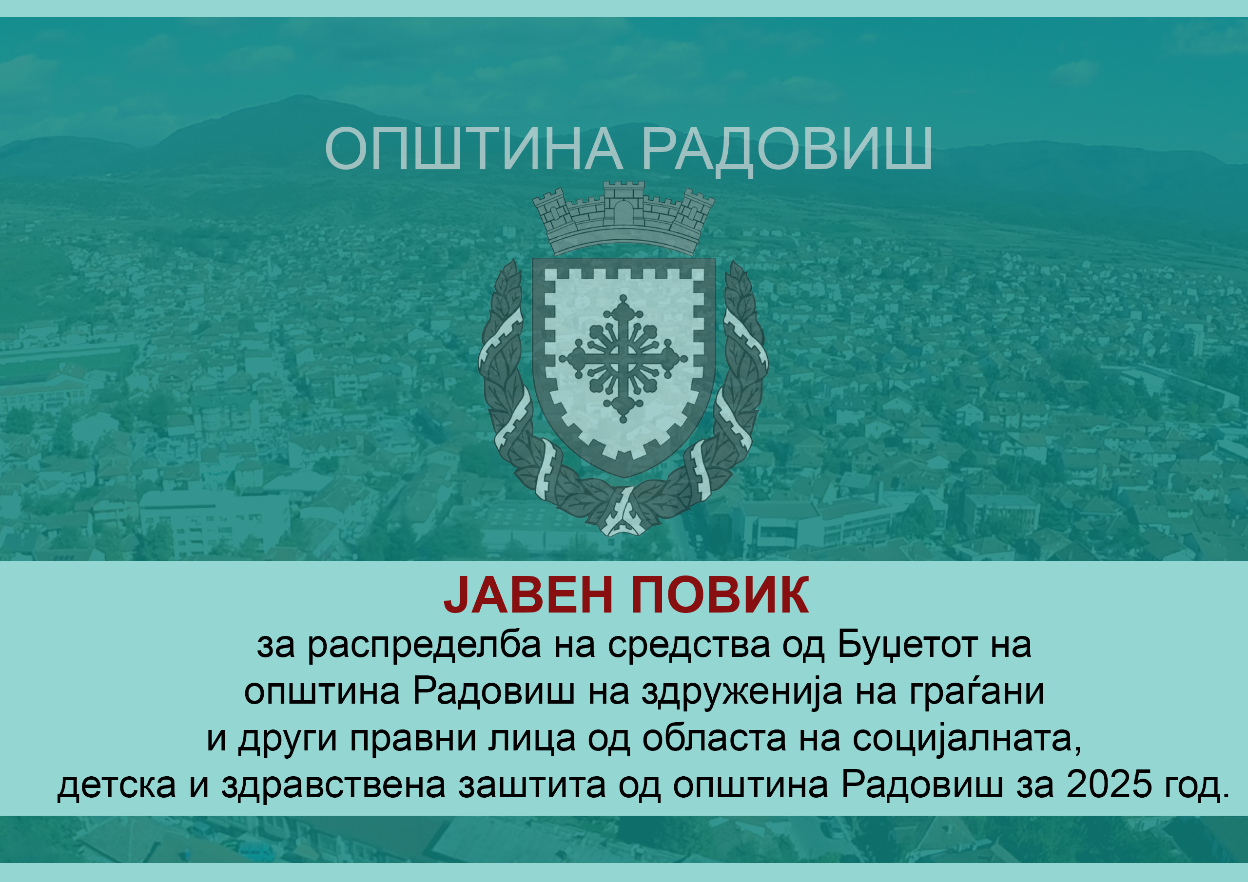 Јавен повик за распределба на средства од Буџетот на општина Радовиш на здруженија на граѓани и други правни лица од областа на социјалната, детска и здравствена заштита од општина Радовиш за 2025 год.