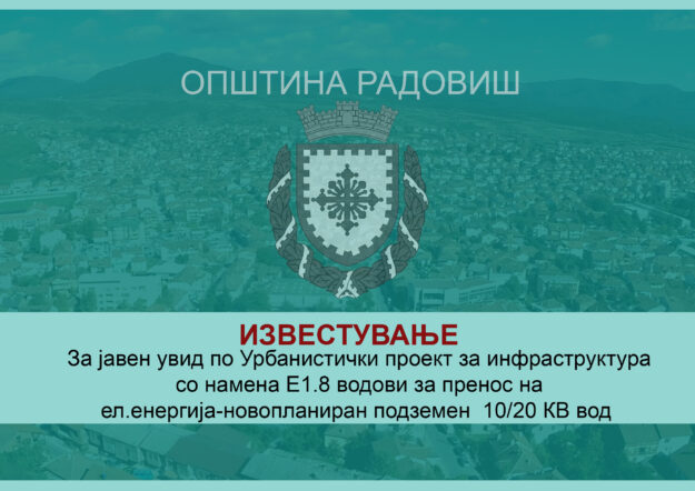 бр. 26 -1431 01.11.2022 год Врз основа на член 62 став(10)Законот за урбанистичко планирање („Сл. в. на РСМ“ бр. 32/20),Општина Радовиш објавува : ИЗВЕСТУВАЊЕ ЗА ЈАВЕН УВИД Известување за јавен увид Урбанистички проект вон опфат на урбанистички план за линиска инфраструктурна градба : Новопланиран СН10(20)кV кабелски подземен вод од КП 991 до КП…