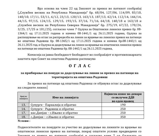 Градоначалникот на Општина Радовиш, решавајќи по барањето поднесено во E – урбанизам со постапка бр.75415 од Друштво за градежништво, трговија и инженеринг увоз-извоз ДОМИНГ ЈТД, за одобрување Проектна програма за Измена и дополна на Урбанистички проект вон опфат на урбанистички план со намена Е1.13- површински соларни и фотоволтаични електрани (фото-напонски панели за производство на електрична…
