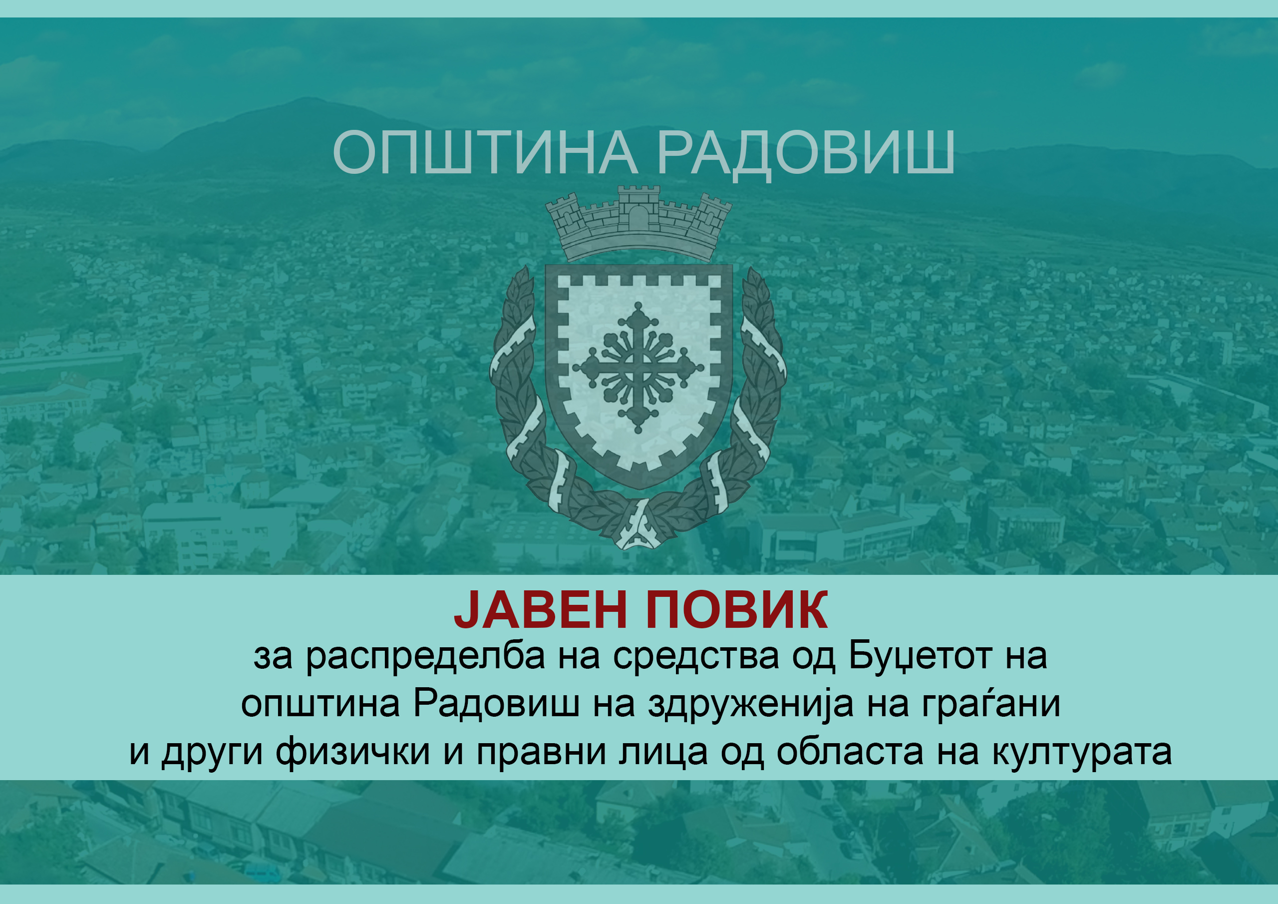 - Се распишува јавен повик за распределба на средства на здруженија на граѓани и други физички и правни лица од областа на културата во општина Радовиш за 2024 година ;